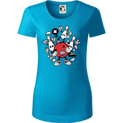 Triko pro hráče bowlingu, na kterém je bowlingová koule a kuželky. Bowlingové triko by měl mít každý bowlingový hráč. S bowlingovým trikem to bude samý strike, žádná kuželka...