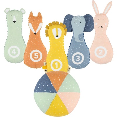 Novinka z kolekce hraček Trixie Baby. Bowling set, se kterým si užijete spoustu zábavy, obsahuje 5 zvířátkových kuželek a 1 barevný balón. Balón a kuželka Mr. Lion chrastí....
