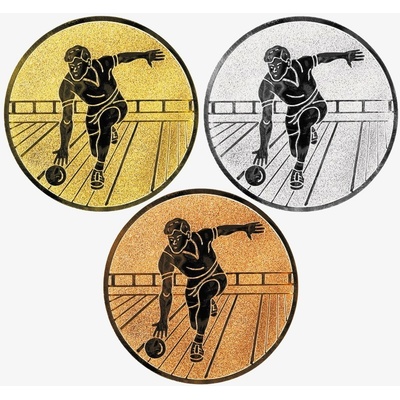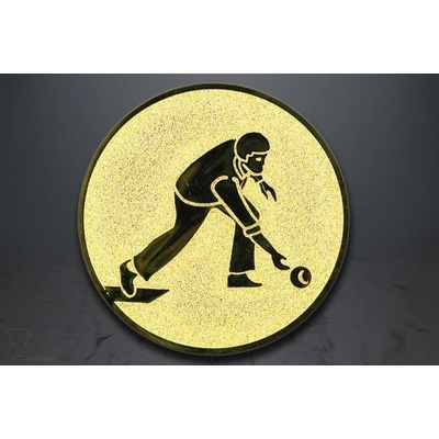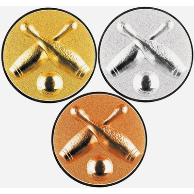 Emblém bowling, kuželky, 25 a 50 mm, zlato Kovové logo o průměrech 25 a 50 mm v barevném provedení zlatá, stříbrná a bronzová. Emblém je možný vložit do medailí, pohárů,...