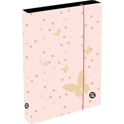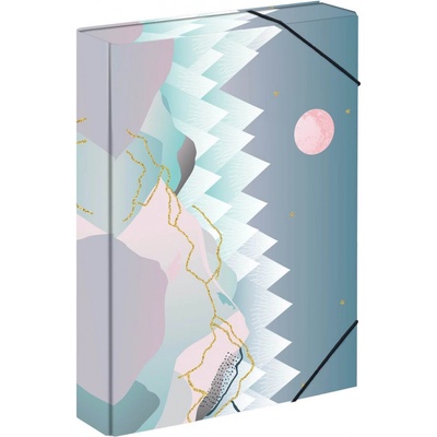 Laminovaný box na sešity je opatřený vnitřními klopami, díky kterým dokumenty nevypadnou a pevné gumičky je udrží zavřené. Desky jsou k dispozici ve formátu A5.