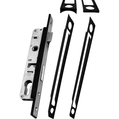 Rozměry zámku: výška x hloubka x šířka: 173x14x40 mmPoužití: na kulatý nebo rovný profil - univerzálníHloubka zádlabu zámku - 38mmRozteč klika a zámek - 85mm