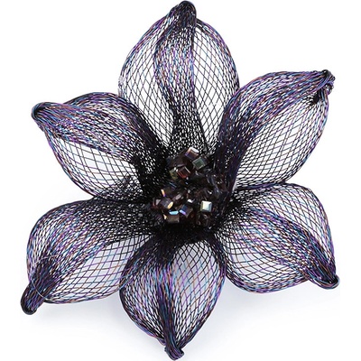 Vzdušná kovová brož květu je ve středu ozdobená broušenými korálky. Okvětní listy jsou z pevné kovové síťky, perfektně drží tvar a mají nádherné kovové odlesky. Brož je velice...