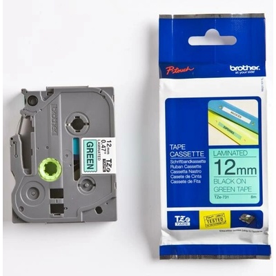 Originální kazeta s páskou Brother TZe-731 - černý tisk na zelené, šířka 12 mm Originální kazeta s laminovanou páskou TZe-731 kompatibilní s širokou řadou tiskáren Brother P-touch je zvláště všestranná díky své snadno čitelné černé a zelené barvě - ideální pro...