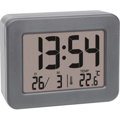 Digitální budík. Přesný čas se pravidelně seřizuje podle rádiového signálu DCF. Na displeji najdete kromě času i datum a zkratku názvu dne v týdnu a vnitřní teplotu....