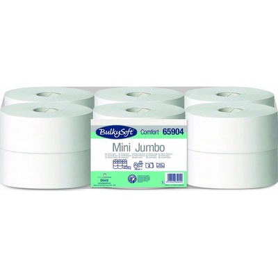 Toaletní papír BulkySoft Jumbo 190 (Mini Jumbo 170) 2vr., 169,75m, celluloza, 12 rolí Surovina: 100% celulóza Počet vrstev: 2 vrstvy Ražba: PLAIN (bez ražby, hladké)...