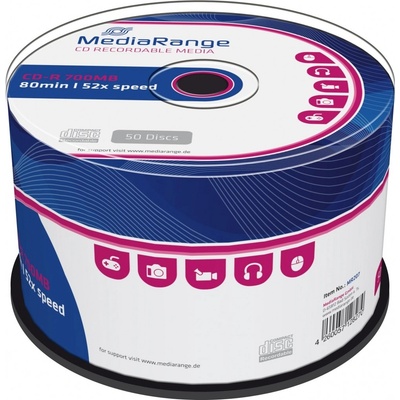 Kvalitní a cenově dostupná média CD-R značky MediaRange. Bílý voděodolný celoplošný povrch k potištění na inkoustové tiskárně, poskytuje spolehlivý zápis dat s kapacitou až 700...