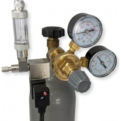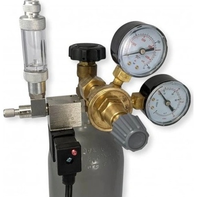 Sestava obsahuje- znovuplnitelnou láhev o objemu 5 litrů, reduktor se dvěma manometry, elektromagnetický ventil, zabudovaný zpětný ventil, jehlový ventil, počítadlo bublin, CO2...