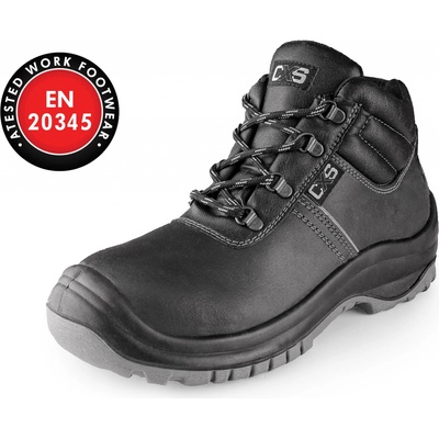 Kotníková bezpečnostní obuv, kožená, s ocelovou špicí a planžetou. Materiál: svršek z 1,8 - 1,9 mm hydrofobní lícové kůže s reflexním PVC páskem, podšívka z prodyšné oděru odolné textilie, podešev: PU-PU, olejivzdorná, antistatická, protiskluzová, odolná proti propichu.