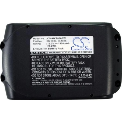 Baterie Cameron Sino CS-MKT830PX EAN: 4894128063148 Napětí: 18.00 V Typ: Li-Ion Kapacita: 3000 mAh Energie: 54.00 Wh Výška: 115 mm Šířka: 75 mm Hloubka: 65 mm Hmotnost bez...