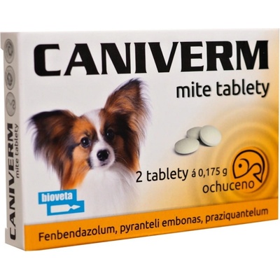 Bioveta Caniverm mite 0,175 g jsou tablety k pravidelnému odčervení koček a malých plemen psů. Léčí onemocnění způsobená hlísticemi a tasemnicemi. S rybí příchutí.