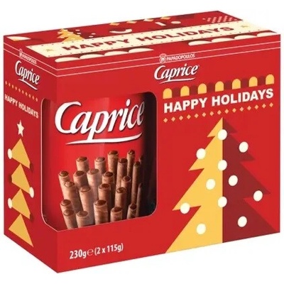 Caprice Papadopoulos Trubičky Xmass Pack 2x115g Legendární křupavě trubičky v limitované vánoční edici Složení: - Cukr, pšeničná mouka, rostlinné oleje : - (palmový olej, olej z palmových jader, bambucký olej). - Laktóza, lískooříšková pasta 6%, odtučněný kakaový...