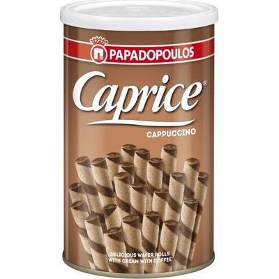 Papadopoulou Caprice Cappuccino 250g Oplatkové trubičky Caprice Cappuccino plněné kvalitním kávovým a kakaovým krémem (63%) mají jedinečnou a originální chuť, která se rozplývá...