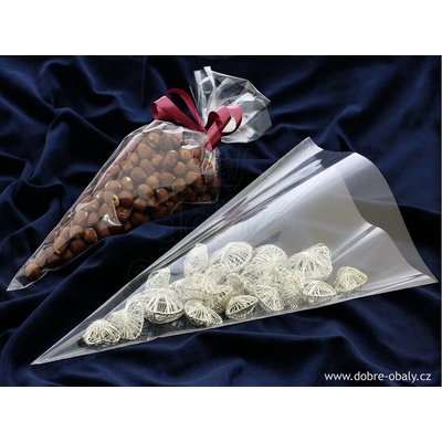Kvalitní celofánový kornout vyrobený ze zcela transparentní fólie. Kornout má svařené boční strany. Rozměry: horní šířka 15 cm, výška 25 cm. Materiál: BOPP fólie. Fólie je určená pro přímý styk s potravinami a je zdravotně nezávadná.