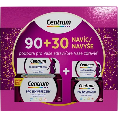 CENTRUM Multivitamín pro ženy dárkové balení 90 + 30 tablet Centrum multivitamin pro ženy nabízí kompletní řadu vitamínů, minerálů a stopových prvků speciálně vytvořených pro potřeby moderních žen. Nyní ve vánočním dárkovém balení.