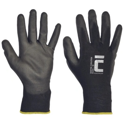 Pletené bezešvé nylonové rukavice, s tenkou vrstvou polyuretanu v dlani a na prstech a pružnou manžetou. Norma EN ISO 21420, EN 388 (4131X). Barva černá. Velikosti: 6-11. Verze...