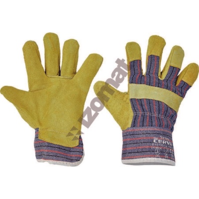 Kombinované rukavice CERVA TERN, vyrobené z kombinace hovězí štípenky a bavlny. Dlaňová část je vyrobena z hovězí štípenky (kůže) a vrchní část a manžeta z bavlněné pruhaté tkaniny (100% bavlna). Normy: EN ISO 21420 EN 388 (1111X) Materiál: Materiál dlaně: hovězí...