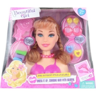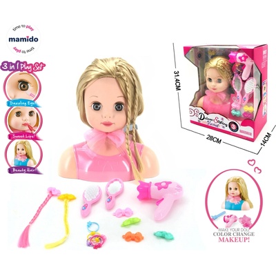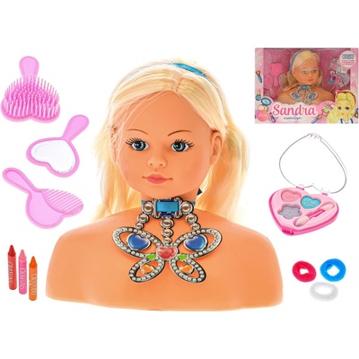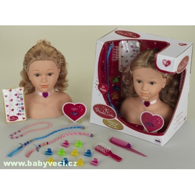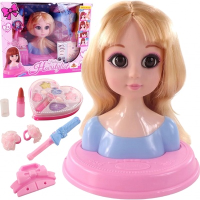 Česací hlava. Rozměr: cca 17 x 22 x 9 cm. Balení obsahuje: gumičky, spirálky na vlasy, sponky, hřebínek a jiné doplňky. Rozměr balení cca 22,5 x 28,5 x 12 cm. Věk:...