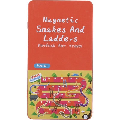 Hra hadi a žebříky magnetická cestovní. Rozměry pouzdra 10x18,5 cm. Plechové pouzdro slouží po otevření jako hrací deska. Figurky jsou magnetické. Součástí hrací...
