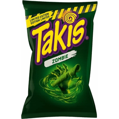 Takis Zombie! To jsou pikantní zelené kukuřičné tortilla chipsy s příchutí chilli a okurky. Pokud milujete vše pálivé, tak si tuto ohnivou smršť rozhodně nesmíte nechat ujít!