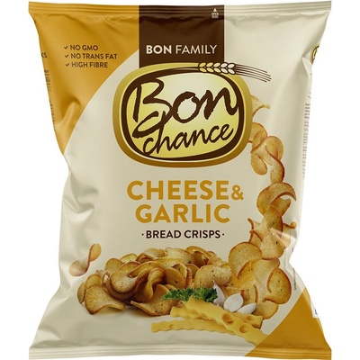 Luxusní Bon Chance křupavé chlebové chipsy připravené z pšenično - žitného chleba dochucené česnekem a sýrem. Lehké občerstvení nejen na doma. Vysoký obsah vlákniny. Neobsahuje...