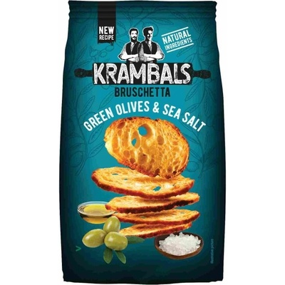 Krambals - pečené krekry s příchutí oliv a mořské soli. Složení: pšeničná mouka (lepek), slunečnicový olej, kořenící směs zelených oliv a mořské soli 7 %, (glukóza, jedlá...