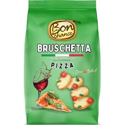 Luxusní pšeničné chlebové chipsy ve stylu italské bruschetty s příchutí pizzy. Pečeno, nikoliv smaženo. Zdravější alternativa klasických chipsů. Neobsahuje GMO ani trans-tuky.
