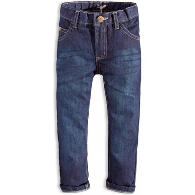 Chlapecké kalhoty z tmavé džínoviny. Klasický střih, kapsy vpředu i vzadu, poutka na pásek. Zapínání na zip a knoflík. V pase stahovací guma. Ohrnutí nohavic není přišité.