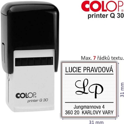 Colop printer Q 30 – vyroba razitka Větší samobarvící čtvercové textové razítko. Jak velký je otisk razítka Colop printer Q 30? Otisk razítka má průměr 30 x 30 mm Kolik...