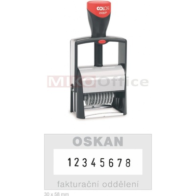 Kovové profesionální razítko s osmi číslicemi a textem Obdelníkové razítko s 5 řádky textu ideální pro kratké slovo (název společnosti) a až 8 číslicemi uprostřed. Srovnatelné...