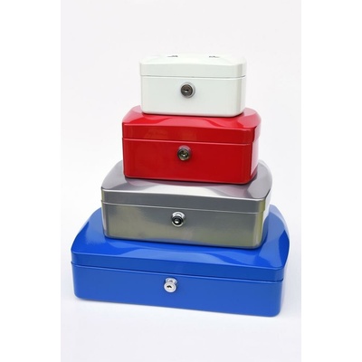 Pokladna je vyrobená z kvalitního ocelového plechu se zaoblenými boky a pěkným víkem. Otočný cylindrický zámek se 2 klíči, plastová vložka s 8 přihrádkami na mince.