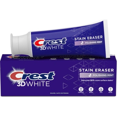 Bělicí zubní pasta Crest 3D White STAIN ERASER Polishing Mint odstraňuje až o 80 % více skvrn ze zubů způsobených vínem, kávou, čajem a dalšími nápoji a jídly ve srovnání s...