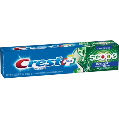 Oblíbená zubní pasta Crest Scope Outlast COMPLETE s "příchutí" Long Lasting Mint (dlouhotrvajíci svěží mentol) využíva system zložek nazvaný EXTRA WHITE Plus na to, aby zuby...