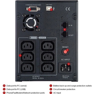 tower UPS, záložní doba při 100% zátěži 1 min, záložní doba při 50% zátěži 7 min, skutečný a zdánlivý výkon 1320 W / 2200 VA, maximální výstupní napětí 230 V, line interactive, 6×IEC 320 C13, ochrana datové sítě RJ-45, ochrana telefonní sítě RJ-11, USB a RS-232, LCD...