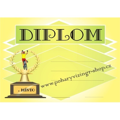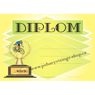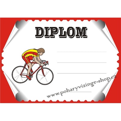 Cyklistický diplom o velikosti A4. Za příplatek 5 Kč je možné do diplomu vepsat text dle požadavků. Požadovaný text, případně logo či obrázek připojte jako soubor k vybrané...