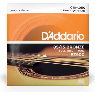 Struny D’Addario EZ900 na akustickou kytaru. 10–50. Struny na akustickou kytaru, vinutí bronzová slitina 85/15. Síla strun Extra Light: .010, .014, .022, .030, .040, .050. Vyrobeno v USA.