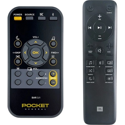 Dálkový ovladač JBL BAR 300, BAR 500 duplikát 1:1 originálního dálkového ovladače. Dálkový ovladač General POCKET duplikát má naprosto všechny funkce a popisky tlačítek stejné...