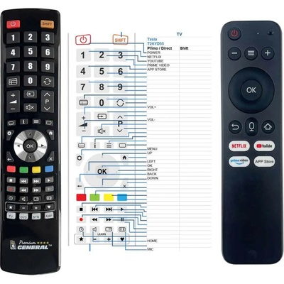 POUZE ZÁKLADNÍ FUNKCE. Náhradní dálkový ovladač pro televizory TESLA TELEVISION. BEZ ZADÁVÁNÍ KÓDŮ. Nahrazuje dálkové ovladače: RC12.5, 12.6, 12.8, E1. Modely televizorů:...