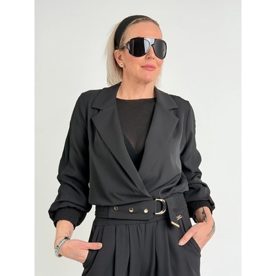 Krátké elastické černé sako v bandážovém stylu je doplněno zlatými ozdobnými knoflíky. Díky pružnému materiálu se krásně přizpůsobí postavě a zvýrazní siluetu. Elegantní...