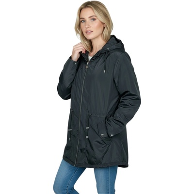 Dámský zateplený kabát s kapucí a bočním rozparkem na druky. Boční kapsy na zip, rukávy ukončeny pružnou manžetou, černé reflexní doplňky na kapuci, rozparku a podél hlavního...