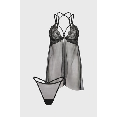 Babydoll je ušitý z průsvitné látky, která je měkká a elastická. Má hluboký výstřih, vyzývavě otevřenou přední stranu, krajkové košíčky a délkově nastavitelná tenká ramínka....