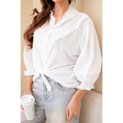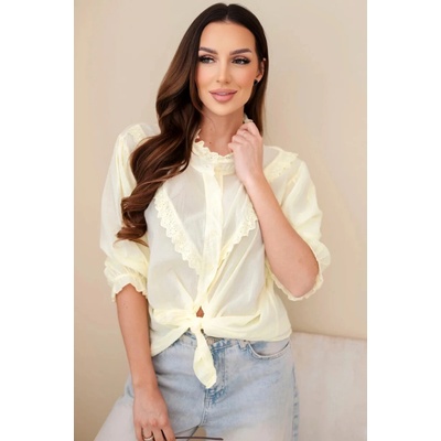 Vyzkoušejte tuto krásnou halenku s výstřihem zdobeným krajkou macramé! Je tak půvabná! Krátké rukávy. Stažený spodní okraj s efektem podkasání.