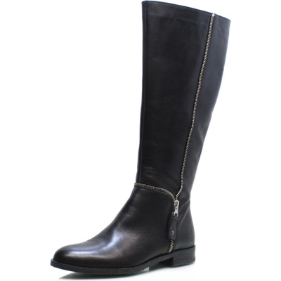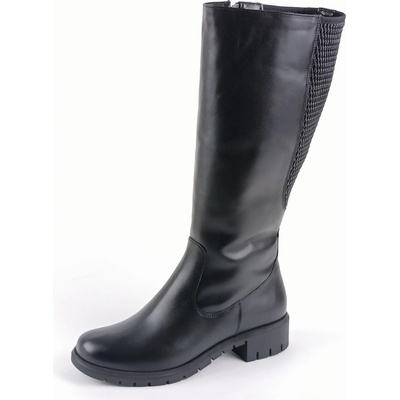 Dámské kozačky Jana na širším podpatku. Černý hladký vzor vypadá elegantně. Díky zipu po straně se snadno obouvají. Kozačky pěkně obepnou lýtko díky stretch materiálu....