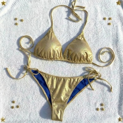 Zlaté bikiny s ručně vyráběným doplňkem ze stejné plavkoviny (třeba do vlasů) a letním tetováním jako dárek Limitovaná edice – pouze 30 setů s ručně šitou stuhou...
