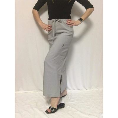 Dlouhá šedá sukně s rozparkem a svázačkou.