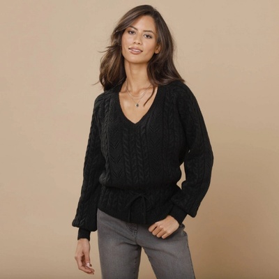 Pohodlí a styl se snoubí v pulovru s výstřihem do V. Ažurový originální vzor. Copánkový vzor na trupu a rukávech. Výstřih do V s žebrovaným lemem. V nízkém pase protažená...