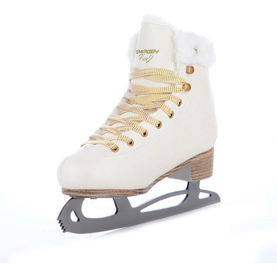Jednodílné dámské brusle v bílo-hnědém designu jsou středně silně vyztužené, svršek je z PVC a tepelný komfort zajišťuje syntetická vlna uvnitř. Zavazování je na šňůrky.