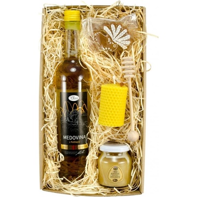 Sada obsahuje: - Medovinu z Potštejna 0,5l - Med květový 170g - Svíčku ze včelího vosku - Paličku na med - Perníček - Špendlík včelka Dárková sada udělá radost jak ženám...