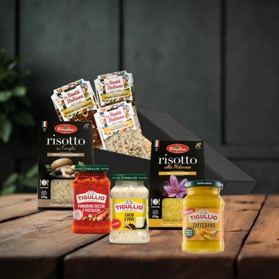 Dárkový koš nejen pro milovníky italské kuchyně obsahuje 8 produktů pro přípravu tradičních italských pokrmů. 3x originální pesto od Tigullio, 2x risotto od Borghini a 3 druhy...
