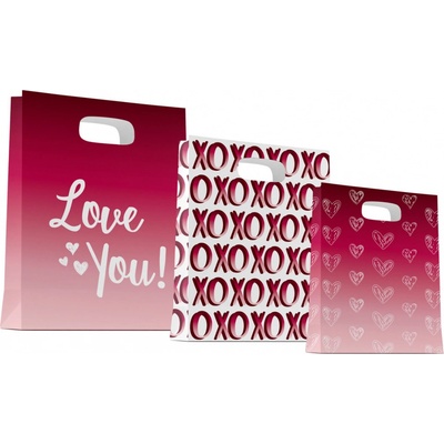 Papírové dárkové tašky Love růžové mix motivů a velikostí, balení obsahu 3 ks: 1. s nápisem Love you o velikosti 20 x 27 x 10 cm 2. s potiskem XOXO o velikosti 15,5 x 23 x 6...