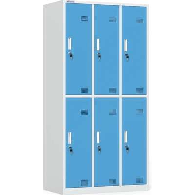 Šatní demontovaná skříňka, výška 1800 x šířka 900 x hloubka 500 mm. Uzamykání cylindrickým zámkem se dvěma klíči. Povrchová úprava práškovou barvou šedá RAL 7047/ modrá RAL 5015.